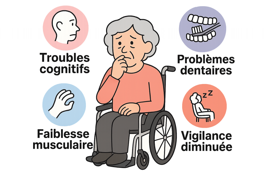 - liés à la personne : la présence de démence, de maladie de Parkinson ou de troubles cognitifs peut favoriser les difficultés de déglutition, notamment lorsque la personne mange trop rapidement, mâche insuffisamment, surcharge sa bouche ou oublie d’avaler. S’y ajoutent des facteurs mécaniques comme une dentition défaillante ou des prothèses mal adaptées, ainsi que la sarcopénie entraînant une faiblesse de préhension. Enfin, une vigilance diminuée et une posture inadéquate pendant le repas majorent le risque : s’assoupir avec un aliment en bouche reste dangereux, quelle qu’en soit la texture.